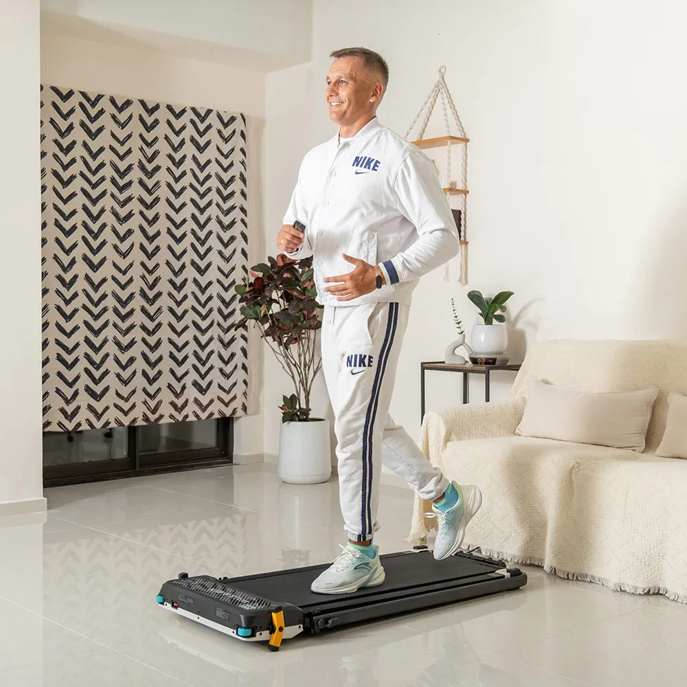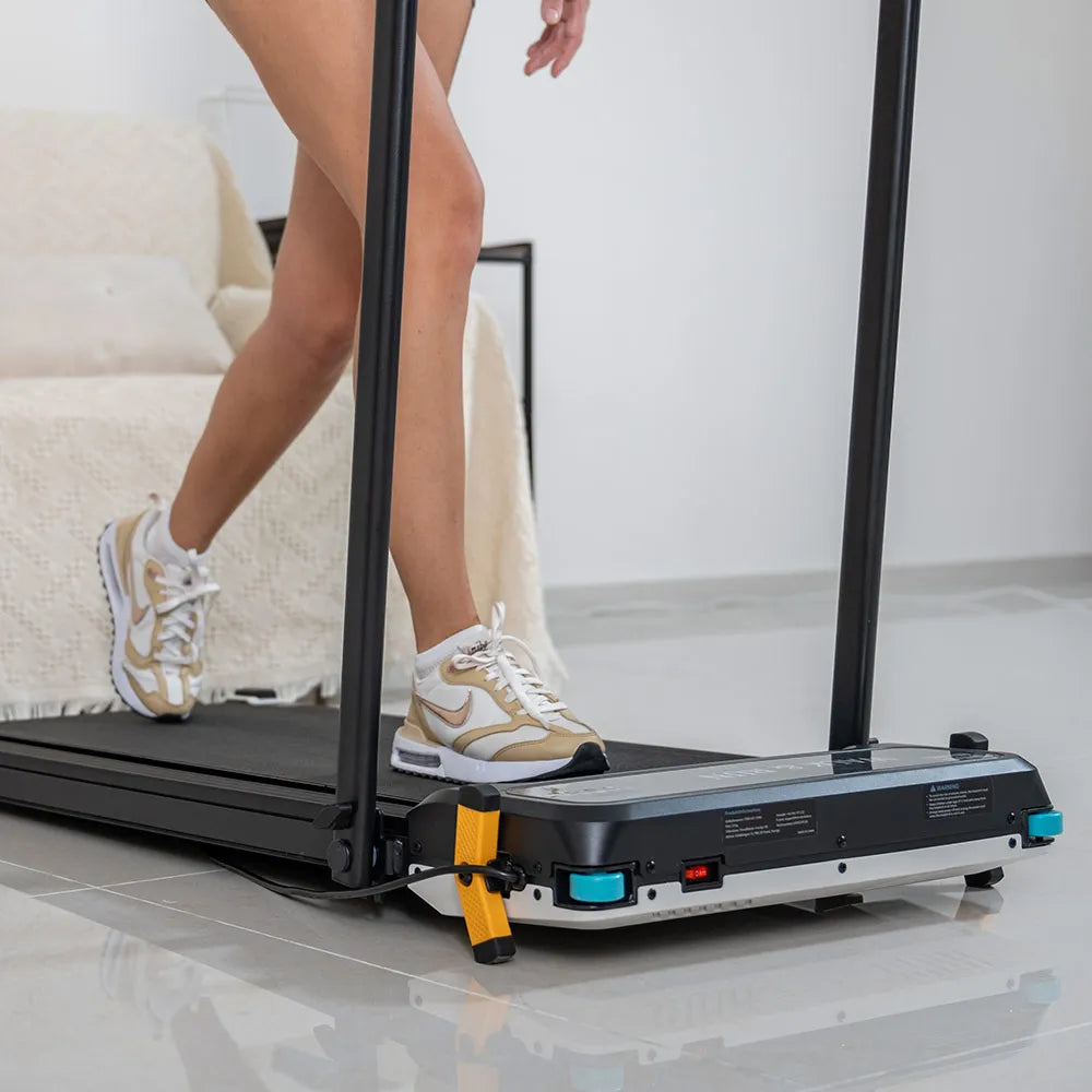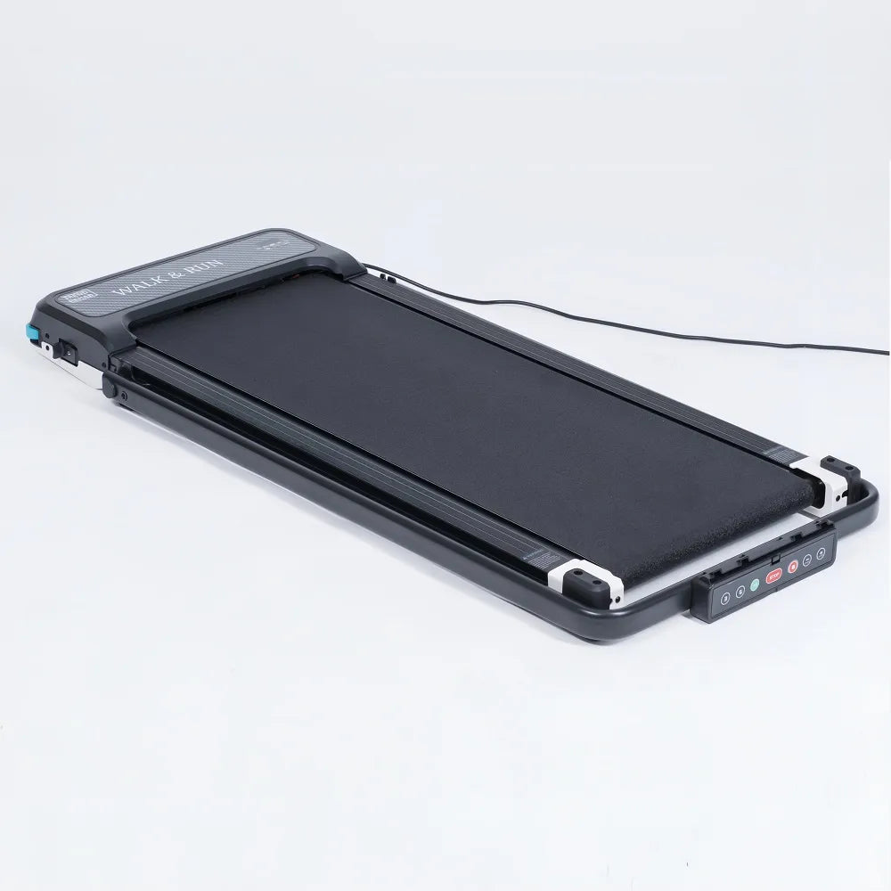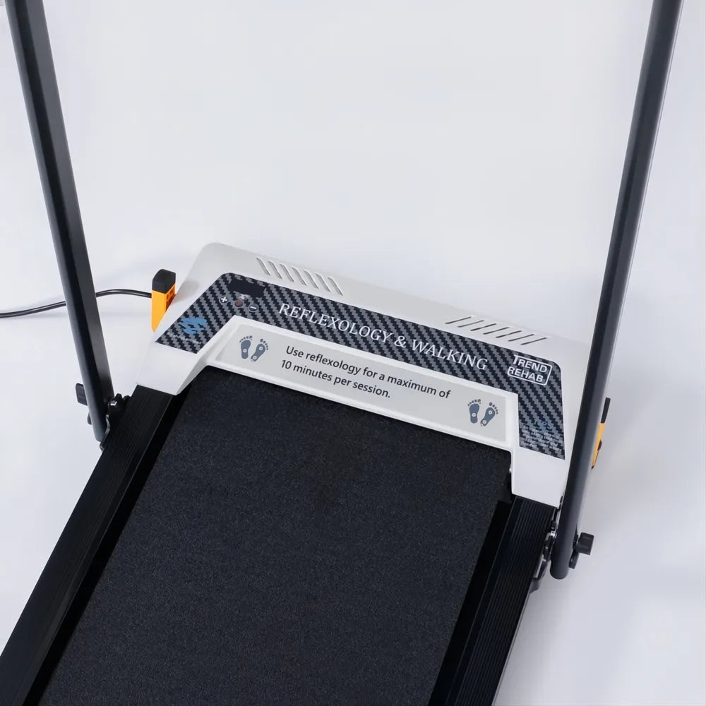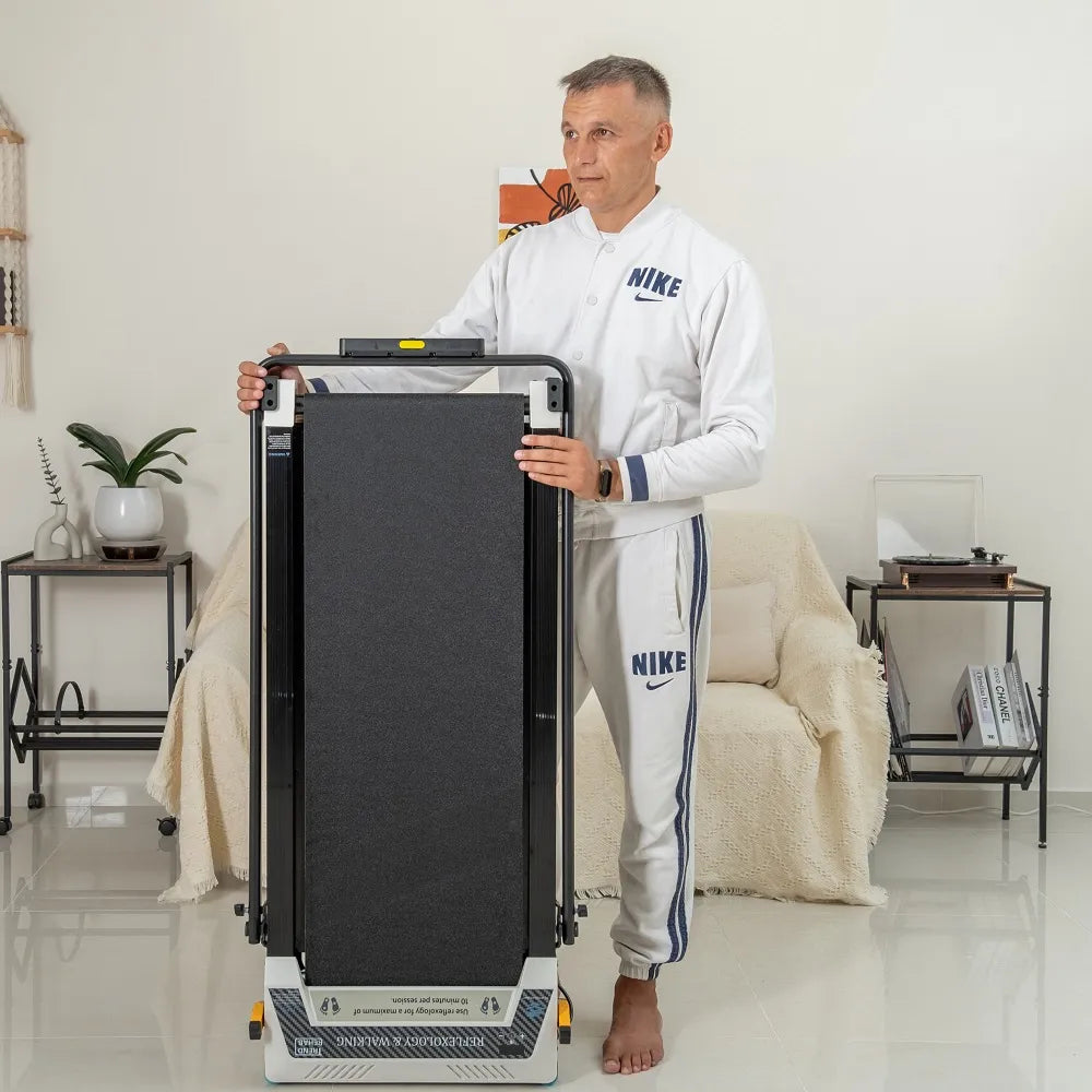 Spec: Kompakt löpband för hemmet. Hopfällbart – tar minimalt med plats. Anpassningsbar hastighet 1-12km/h. Vänd plattan – femstegs fotmassage via zonterapi.